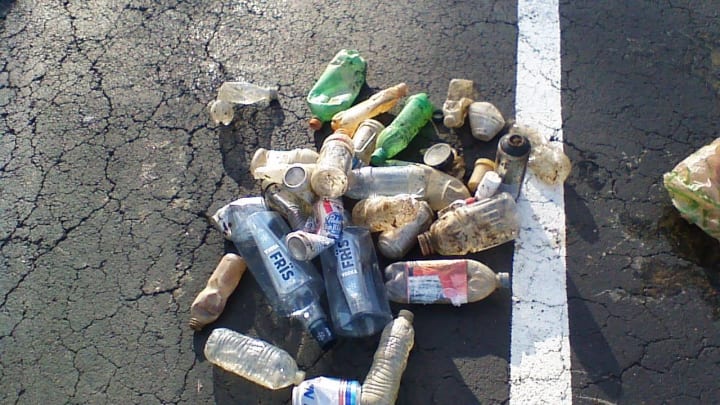 That Sunday afternoon was humid even before the hot summer had arrived. I had worn old sneakers and clothes along with citronella wrist bands but began to wonder about the ticks. I did not actually go into the creek but tried to keep my balance walking along the uneven bank. Some kayakers were coming and going and must have thought me crazy as I repeatedly came out of the bushes wearing plastic gloves and carrying plastic bags of trash and recyclables. I was determined to recycle as much of the plastic, metal, and glass as I could. Thankfully, my small church had a dumpster for trash and a dumpster for recyclables. I found myself growling more and more. I could understand losing a flip flop while canoeing or having trash blow from your garbage can, but rusted cans of chemicals and Styrofoam cups of bait seemed less excusable.