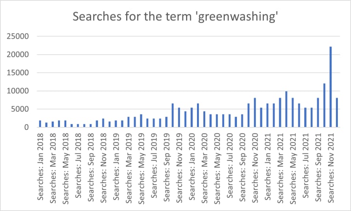 Fig. 1 details the average monthly searches for the term greenwashing over the course of the past four years – during the COP26 event in November it is clear that the number of searches grew considerably, peaking at 22,200. (source – Google Ads)