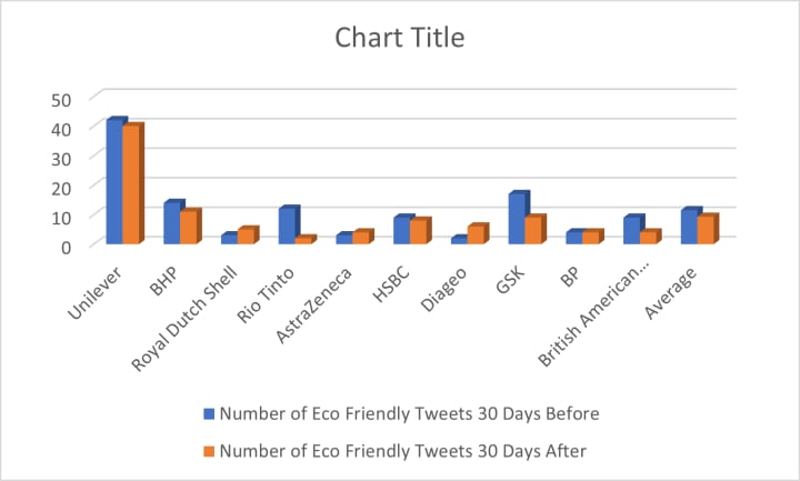 Using each of the businesses’ Twitter accounts, we analysed the number of tweets positively relating to the environment 30 days before COP began on 31st October and 30 days after it finished on 12th November. Ultimately, we wanted to investigate whether or not the climate change event which took place in Glasgow actively encouraged an upturn in the amount these companies were talking about, and promoting their work within, the environment.