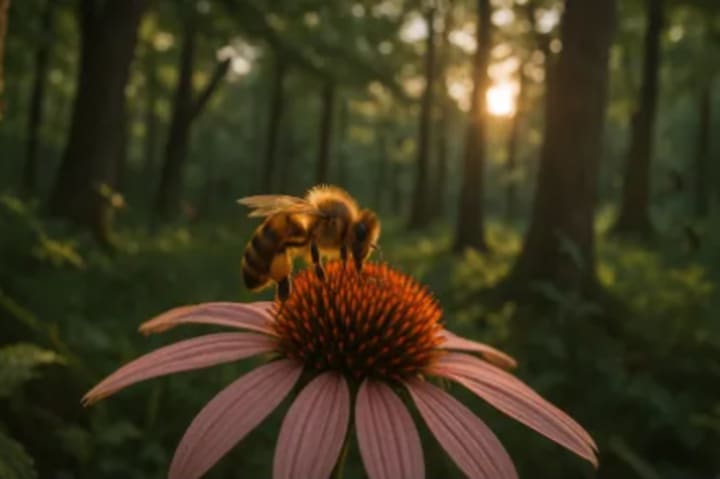 Take it in. When did you last sit to watch a bee, legs loaded with pollen, busy making its way across a bloom? Or hold the cool moist earth in your hand? Or actually hear the music of a forest — leaves scuttling, chirping chorus, maybe even the outraged squawk of a blue jay who's had enough of your stopstill hanging around by now?
