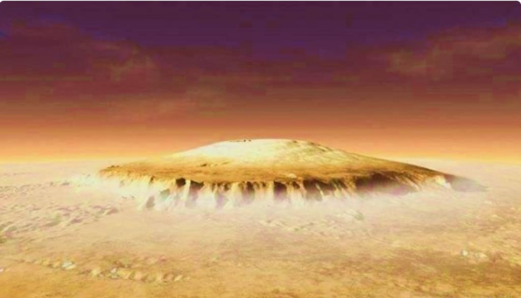 Mount Olympus has a gentle slope and is shaped like a giant shield. The base of the volcano is 600 km in diameter. The sea floor covers an area larger than the land area of the United Kingdom. It is over 27 km high and reaches 21.9 km at its highest point, three times the height of Mount Everest, the fourth-highest peak on Earth. The crater is 80 kilometers in diameter and 3 kilometers deep. That's enough for two Londoners. By comparison, the largest volcano on Earth is Mauna Loa on the island of Hawaii. Its base is about 200 kilometers in diameter, 4,170 meters above sea level, and about 9,300 meters under the sea, which means that the entire island of Hawaii could be stuffed into Mount Olympus.