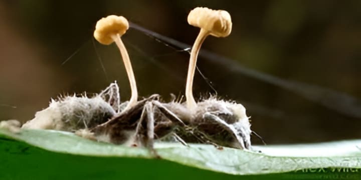 Certain parasitic fungi infect insects, using them as hosts to complete their life cycle. These fungi can manipulate the behavior of the host, causing it to climb to a higher position before the fungus releases spores that spread to other potential hosts.