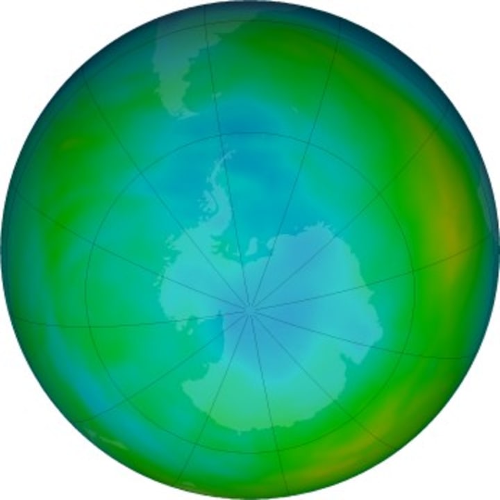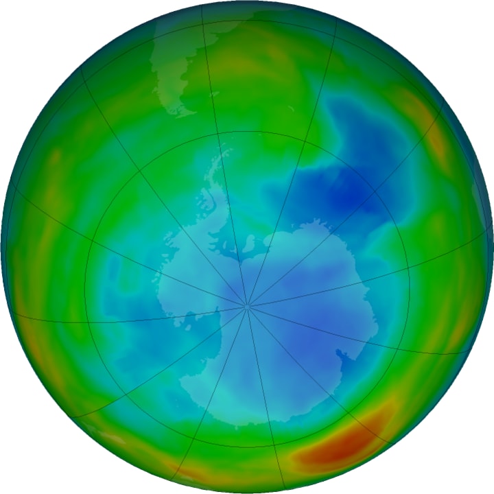 The image below shows the false-colour view of total ozone over the Antarctic pole on 31 July 2018 registered by NASA's Ozone Hole Watch. The purple and blue colours are where there is the least ozone, and the yellows and reds are where there is more ozone.