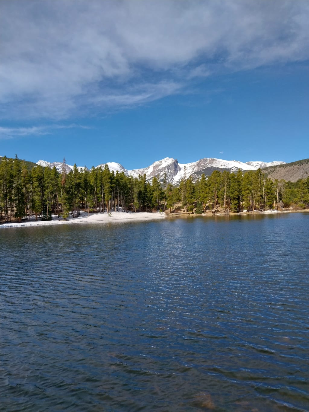 The soft, swishing sounds of the waves in perfect unison with a gentle breeze drifting through the trees and shaking their leaves. My gaze lifts and glides over the deep blue surface of the lake. A blurry mirror reflecting the surrounding forest and high snow-capped mountains in the background. Peaks perfectly blending into the light morning sky.