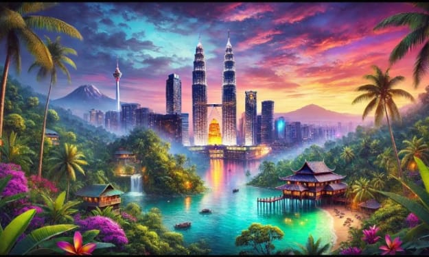 A digital painting of England's iconic landmarks and landscapes. The scene features the Tower Bridge at dusk with glowing lights reflected in the River Thames, Big Ben in the background, and the countryside's lush green hills and blooming flowers under a twilight sky. This stunning artwork captures the harmony of England's urban charm and rural beauty.
