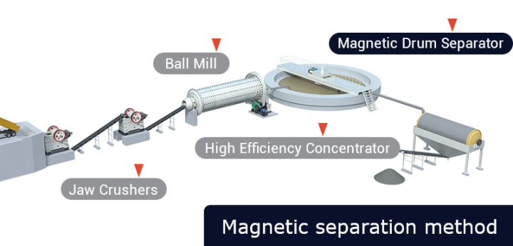 The equipment is the magnetic separator. You can use a strong magnetic separator for weak magnetic ilmenite, a medium magnetic separator for vanadium titanomagnetite, and a weak magnetic separator for placer-type ilmenite (containing magnetite).