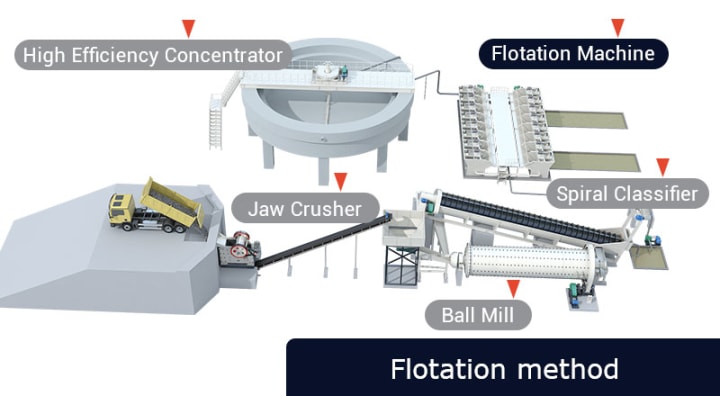 (3) Perovskite-titanomagnetite: Use the method of magnetic separation - flotation separation. Wet magnetic separation is used to select titanomagnetite. Then the calcite is floated with a fatty acid collector, and the ilmenite is floated after removing the middle ore.