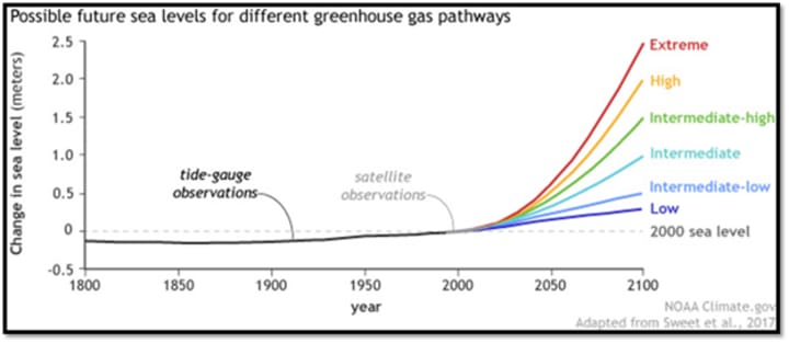 When considering the Maldives’s overall topography into question, the incredibly low-lying nature of the entire nation and the anticipated rise in sea levels year after year due to the ongoing exponential effects of global warming leave the nation very susceptible towards imminent thermal expansion of the ocean over the course of this century. The projected sea level rise of 0.3-2.5m by 2100 leaves Maldives very vulnerable to marine transgression in the form of severe flooding incidents and prevalent coastal erosion due to global warming [3]. Maldives is in a potential range to lose approximately 80% of its land by 2100, losing countless homes in displacing an estimated 250,000 individuals and integral infrastructures [3].