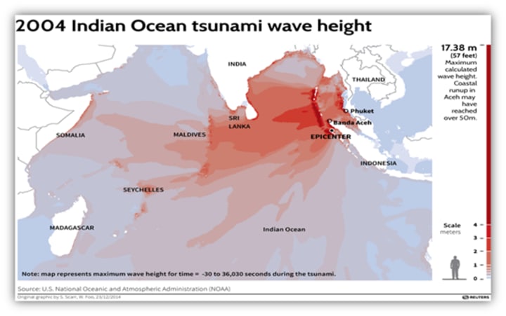 To truly illustrate Maldives’s vulnerability to ever rising sea level, the Indian Ocean Tsunami occurring in 2004 lends itself well as a case study to further illustrate the dire straits the nation finds itself in. In 2004, a massive 9.2 earthquake shook the country of Sumatra, enacting a tsunami to ravage Maldives and all neighboring countries surrounding the Indian Ocean. Although Maldives had not received the brunt of this disaster, the country did suffer 39 of 200 inhabited islands significantly ravaged and the displacement of over 20,000 people, not to mention experiencing the deaths of 88 individuals and the loss of 24 others (presumed dead) [4]. Taking into consideration the significant overall impact despite being roughly 2,000 miles away from the epicenter, Maldives took a serious hit overall from this disaster. When compared to a country like Malaysia, much closer in proximity to the epicenter, the damage dealt was on par if not lessened due being significantly higher above sea level compared to Maldives, further highlighting Maldives’s susceptibility as a direct result of its natural topography. Such examples like this explicitly indicate how much at risk the Maldives truly are to sea level rise and immediate action is clearly necessary for the Maldivian people’s sanctity.