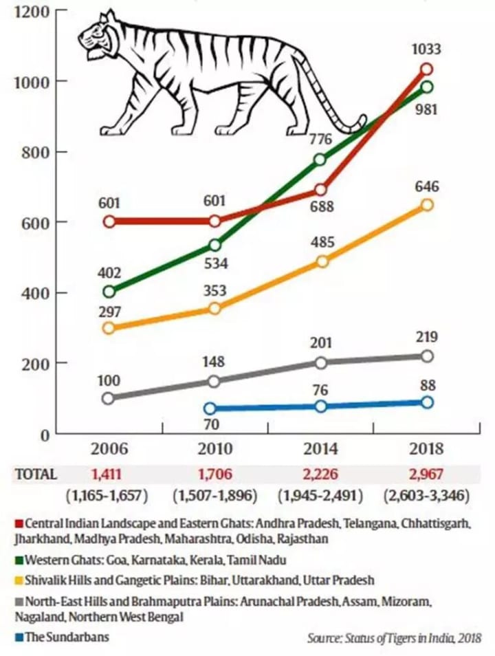After a century of decline, overall wild tiger numbers are starting to tick upward. According to a recently reported tiger census, there are 2967 tigers in its fauna. India currently hosts the largest tiger population accounting for two-thirds of the world's population. India is the only country that achieved the target of doubling its tiger population owing to its pledge taken at St. Petersberg in 2010.