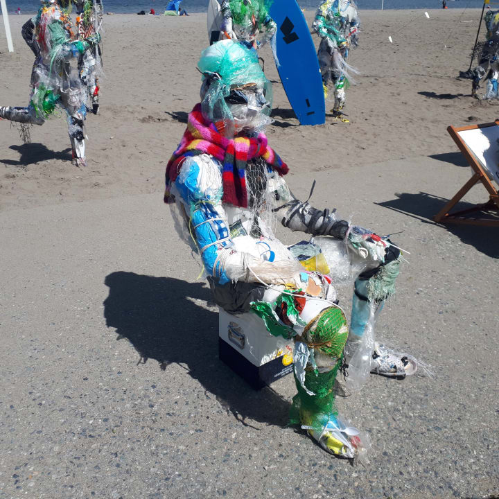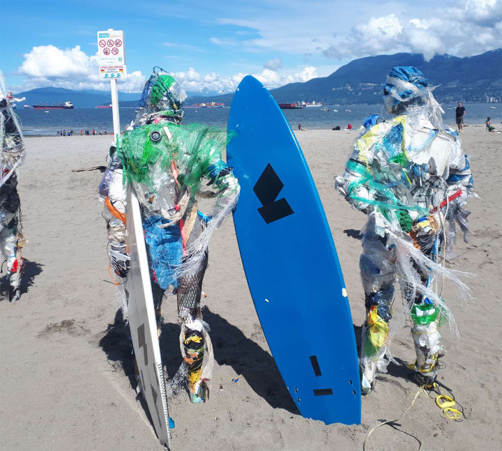 A group of action figures created with waste plastics removed from beaches, water and shorelines are now on display at Kitsilano Beach in Vancouver, British Columbia, Canada. They were created by the multidisciplinary artist Caitlin Doherty. She designed and created the human-looking characters with plastic junk removed from Canadian waters.
