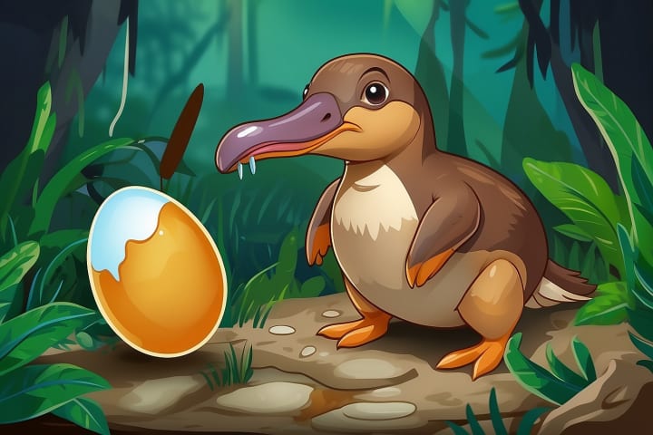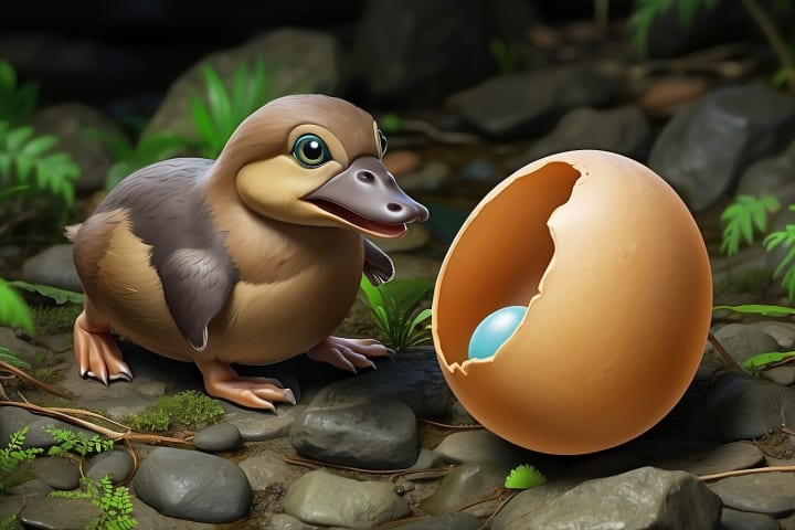 Platypuses are unique among mammals in their reproductive process. Females lay 1-3 eggs, which they incubate by curling around them. The eggs hatch after about ten days, and the mother nurses the young by secreting milk through specialized mammary gland ducts, as they lack nipples.