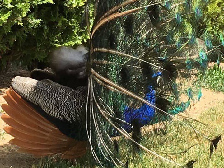 At first, he strutted in a vainglorious fashion all over the property. His plumage swept the grounds while walking as if it were a royal train. He seemed quite used to people, and I had to ask him, "Are you showing off for me now?" He shifted a little pompously, and I realized I could not have been more wrong. Almost invisible in her plainness, a peahen stood behind, looking at the ground, wandering, and basically doing her own thing.