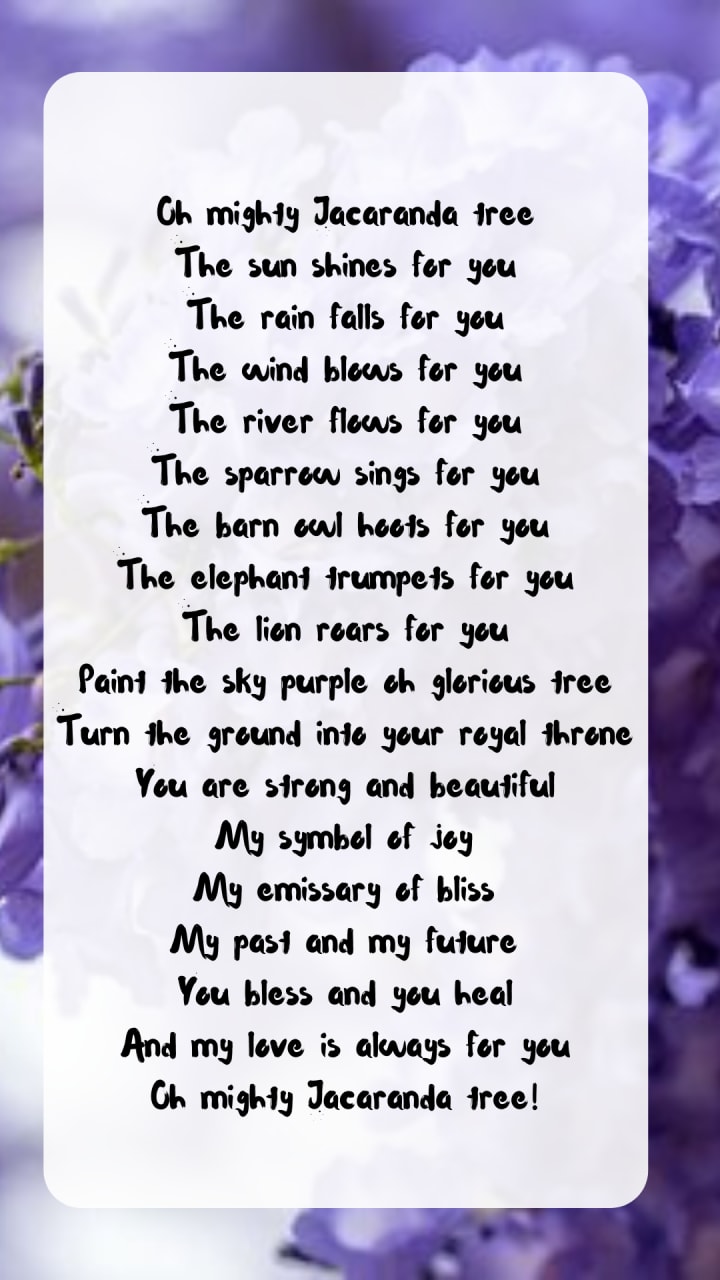 Soft, delicate purple bliss blooming in October. Covering the brown earth like a lustrous glorious carpet. Gigantic and majestic, branches spread out, rising up to the blue sky. The mighty Jacaranda.