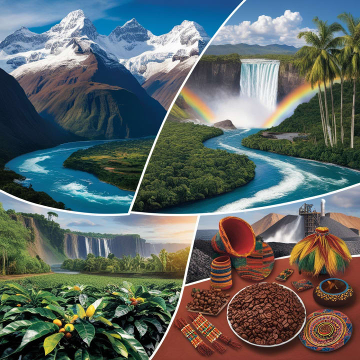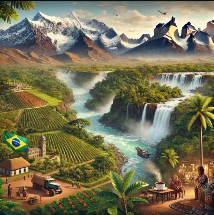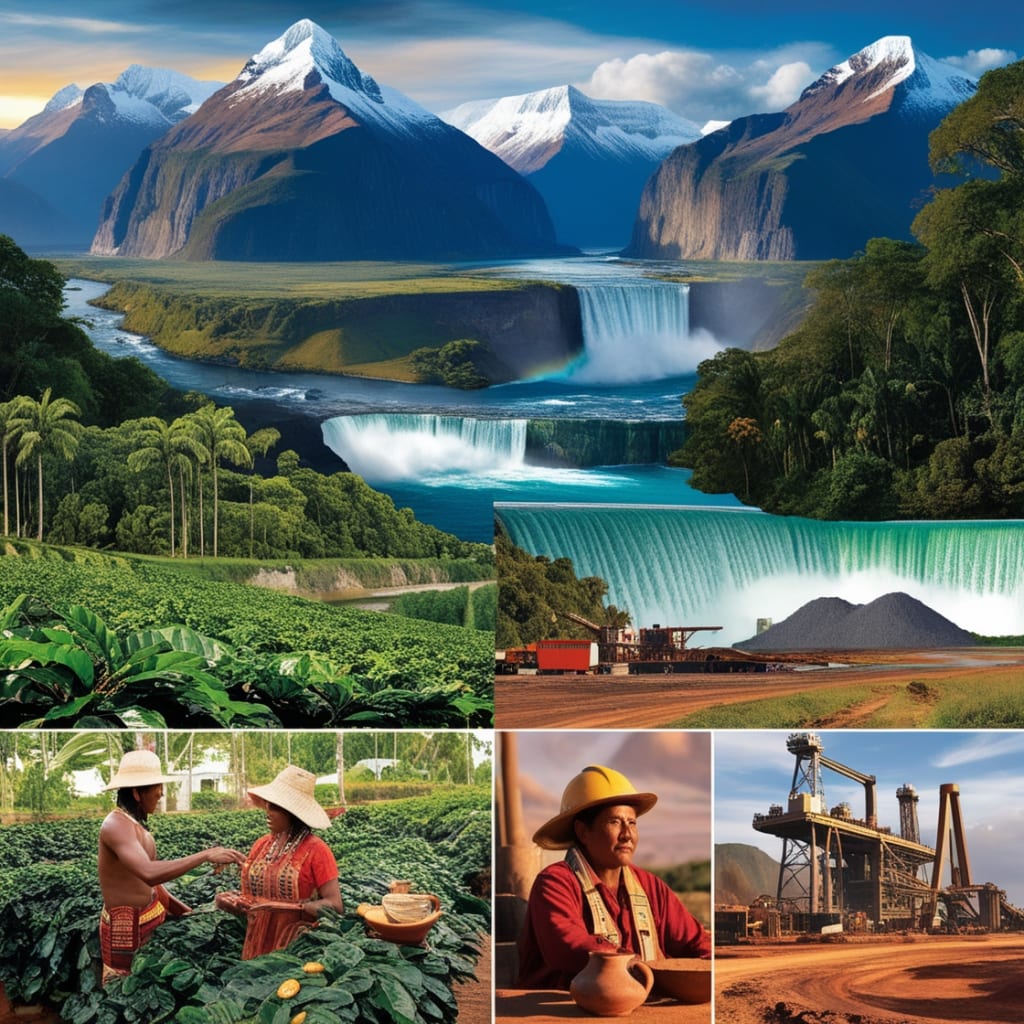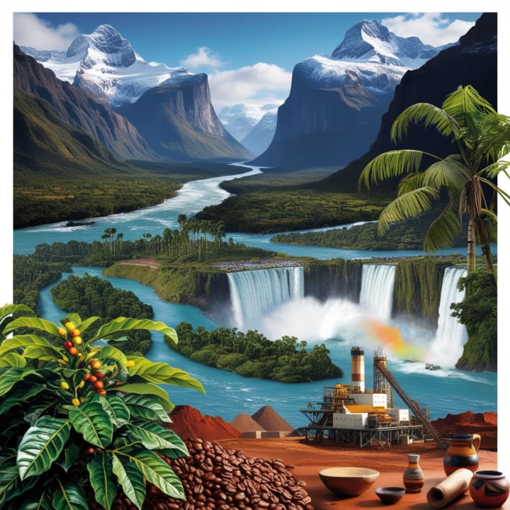 This captivating image showcases South America’s breathtaking landscapes and abundant resources. The majestic Andes Mountains rise in the background, while the lush Amazon Rainforest sprawls beneath, cradling a winding river. The iconic Iguazu Falls cascade in the distance, adding to the region’s natural beauty. In the foreground, a flourishing coffee plantation and an active mining site highlight the continent's agricultural and mineral wealth. Indigenous cultural elements subtly remind us of South America’s rich heritage.
