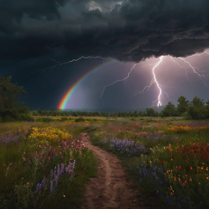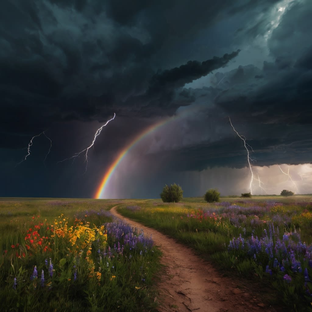 A vibrant and dramatic portrayal of nature's raw power and beauty. Dark storm clouds loom over a countryside path, illuminated by a radiant rainbow cutting through the gloom. A jagged bolt of lightning electrifies the sky, creating a striking contrast against the delicate hues of the rainbow. The foreground features a colorful meadow of wildflowers, symbolizing resilience and hope amidst chaos.