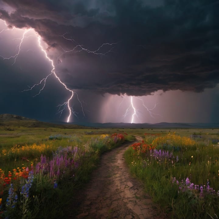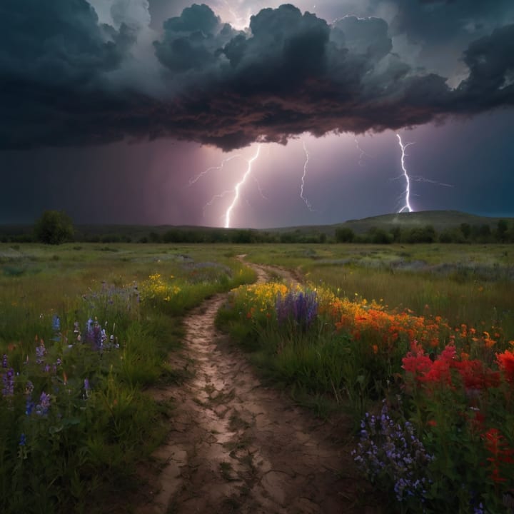 Imagine standing in a field just after a storm. The air is thick with the scent of rain-soaked earth, and the last drops of water cling to leaves and flowers. Above, a rainbow stretches across the horizon, its vivid hues cutting through the gray. A flash of lightning in the distance momentarily illuminates the scene, casting sharp shadows over the landscape.