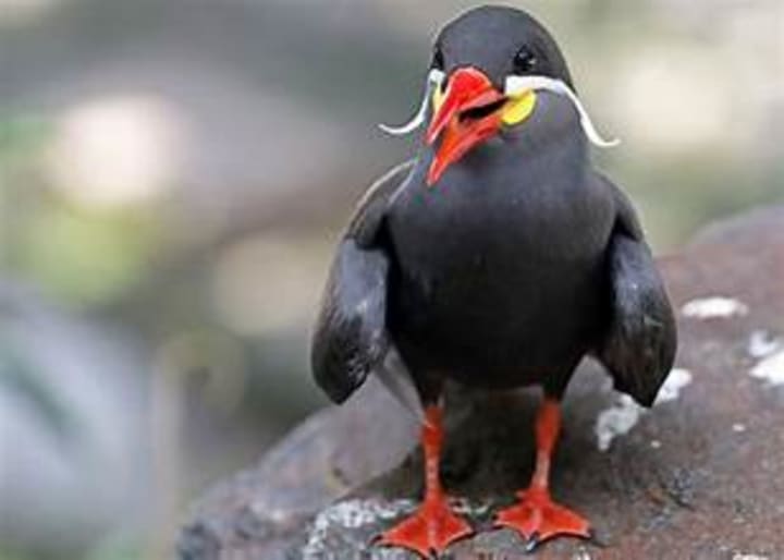 Inca terns are seabirds known for their white “Salvador Dali” moustaches and reddish claws and beaks. They make their homes along the Pacific Coast, primarily in Peru and Chile. These birds live on rocky cliff faces. Inca terns come together in large colonies, and their calls are compared to a distinctive cat’s meow. Their diet includes anchovies and small fish.
