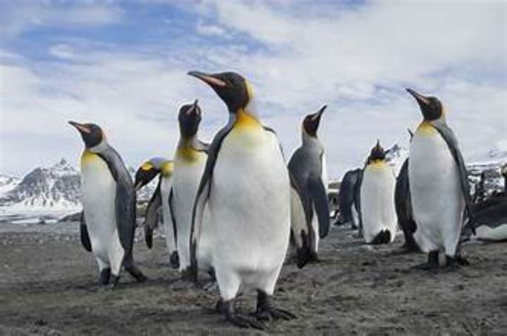 King penguins can be seen on the shores of Bluff Cove, Falklands, and Tierra del Fuego, Chile. These penguins can dive to an amazing 1,180 feet and have eyes adapted to the darkness at that depth. These birds can eat 2,000 fish a day. King penguins are recognizable by their orange-yellow feathers on their chests.