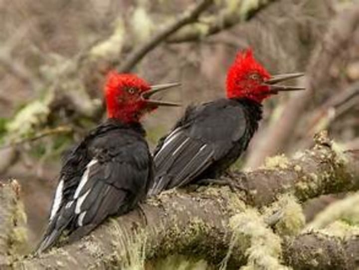 Magellanic woodpeckers are the largest woodpeckers in South America. They are striking-looking black birds, with the males standing out with their bright red heads. They can be seen in the Patagonian woodlands of Chile and Argentina as well as on Tierra del Fuego. These woodpeckers feed on larvae, beetles, and other insects found by boring into living or dead trees. Lizards and the nestlings of smaller bird species may also be part of their diet.