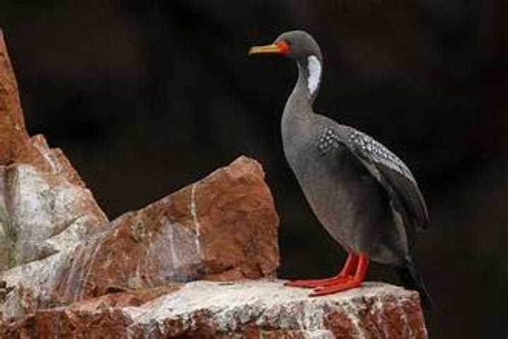 Red-legged cormorants are solitary birds that usually hunt alone or in pairs. The birds are known for their red legs, white throat patches, and yellow-red hooked beaks. Red-legged cormorants live all along the Atlantic coast of Chile and around the Strait of Magellan in the extreme southern coast of Argentina. They can be seen nesting on rocky cliffs or resting on jetties. Their diet consists of eels and anchovies, and they can dive up to 30 feet underwater to catch prey, swimming at speed with their webbed feet.