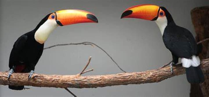 Toco toucans can be seen in eastern and southern Brazil, Bolivia, Paraguay, and into northern Argentina. However, one of the best places to spot these birds is Sao Paulo, Brazil, where they attack highway cameras. They are recognizable for their large yellow-orange bills. The birds inhabit tropical forests, gathering in small flocks. Toco toucans dine on fruits.