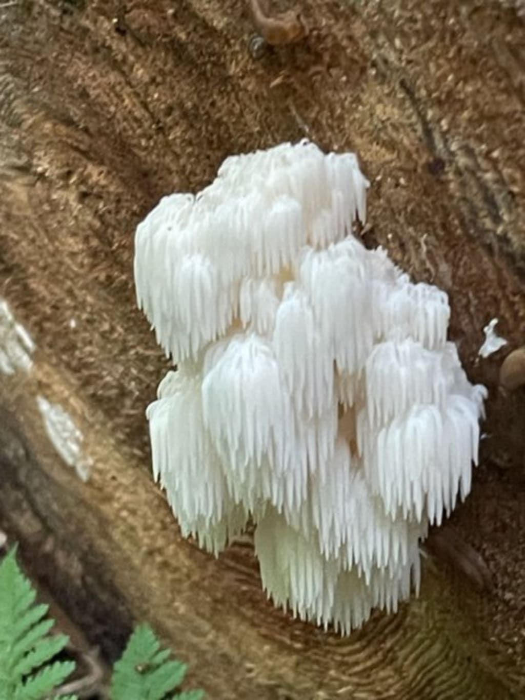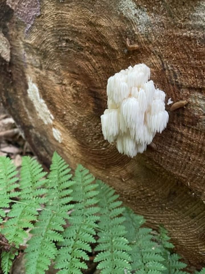 The first fungi we looked up was the white one with the icicle-like projections. We were able to positively say it was Bear's Head Tooth. This fungus does not have gills or pores, but teeth (the hanging projections) instead. Its scientific name is Hericium americanum.