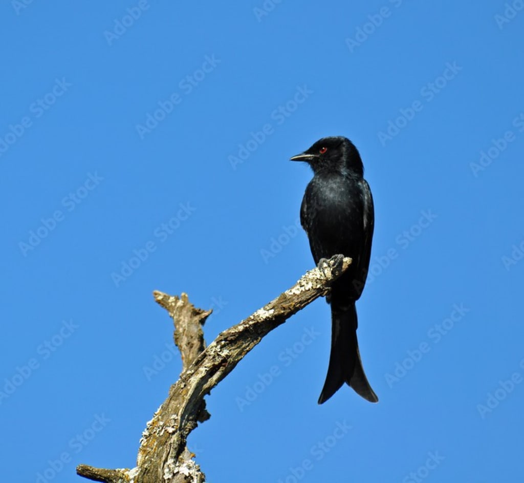 The Black Drango Bird stands out with its glossy black plumage and a deeply forked tail, which gives it exceptional maneuverability during aerial acrobatics. The male and female birds exhibit little to no sexual dimorphism, sharing similar appearances. Their beaks are slender, perfectly designed for capturing insects mid-flight, and their eyes radiate a curious intelligence. Additionally, they boast crimson-red eyes, which intensify their enigmatic aura.
