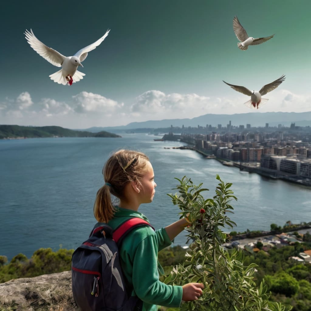 The little dove, who had been watching everything from above, finally smiled. She flew down to Greta and landed softly beside her. In her beak, she carried a tiny olive branch — the ancient symbol of peace and hope.