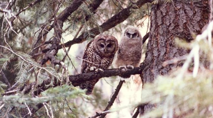 They list the Northern Spotted Owl as a threaten species. The primary cause is loss of habitat. It lives in Washington, Oregon, and California. It is a medium-sized, dark brown owl, with a barred tail.