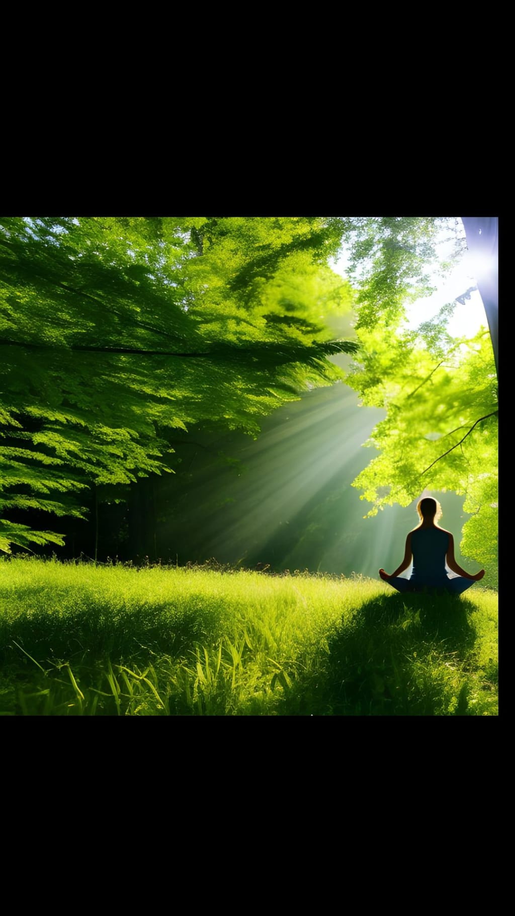As the person settles into a comfortable seated position, their eyes gently close, and a serene smile graces their lips. The gentle breeze rustles the leaves above, creating a soothing melody that harmonizes with the distant songs of birds. The lush greenery envelops them, offering a sense of security and tranquility.