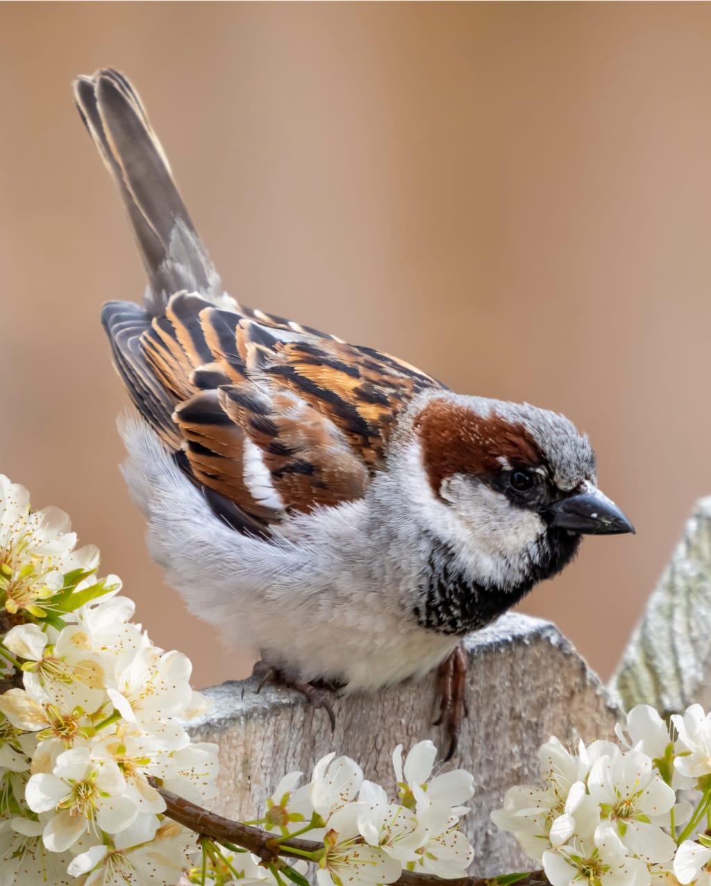 This species typically exhibits sexual dimorphism, with males and females displaying distinct physical characteristics. The male House Sparrow flaunts a gray crown and black bib that extends down the chest, coupled with chestnut-colored nape, while its wings are striped in black, gray, and buff hues. Females are less flamboyantly colored, wearing a beige-brown plumage, and lack the striking black bib.
