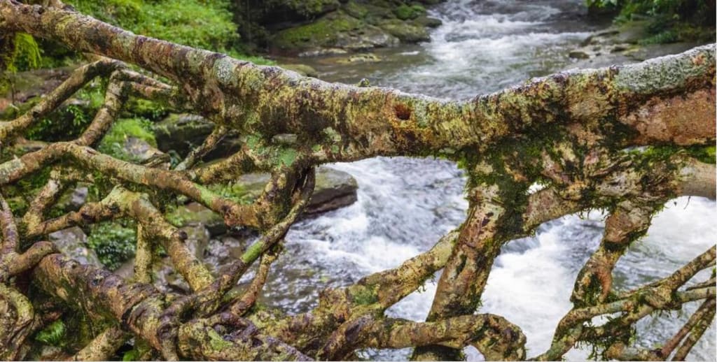When monsoon clouds bring pelting rains to the village of Tyrna, Shailinda Syiemlieh takes the nearest bridge to reach the opposite bank of a gushing stream. The bridge is no ordinary structure made of concrete and metal. Instead, it is composed of a single giant fig tree that sits by the riverbank, and the support that Syiemlieh walks over is a mishmash of aerial roots tightly knotted and woven together. The bridge is not only a part of the landscape, it is helping to support its ecosystem at the same time.