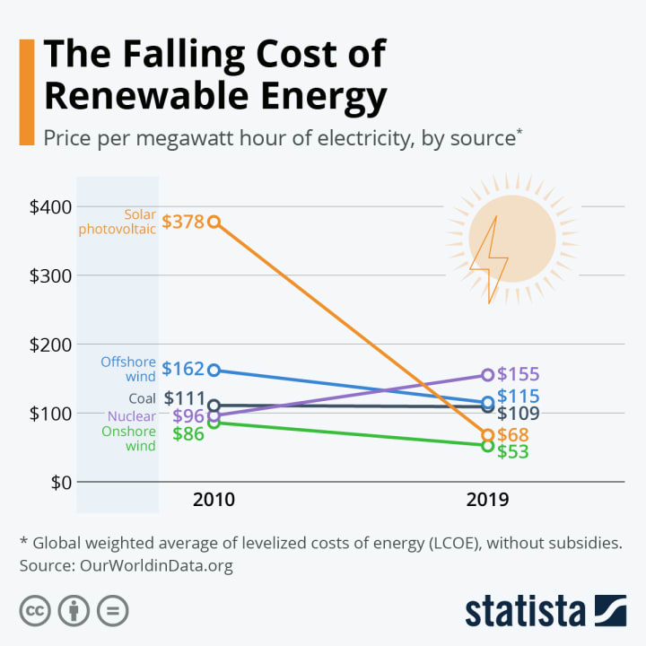 Source: Statista, “The Falling Cost of Renewable Energy,” October 2021 (Used with permission)