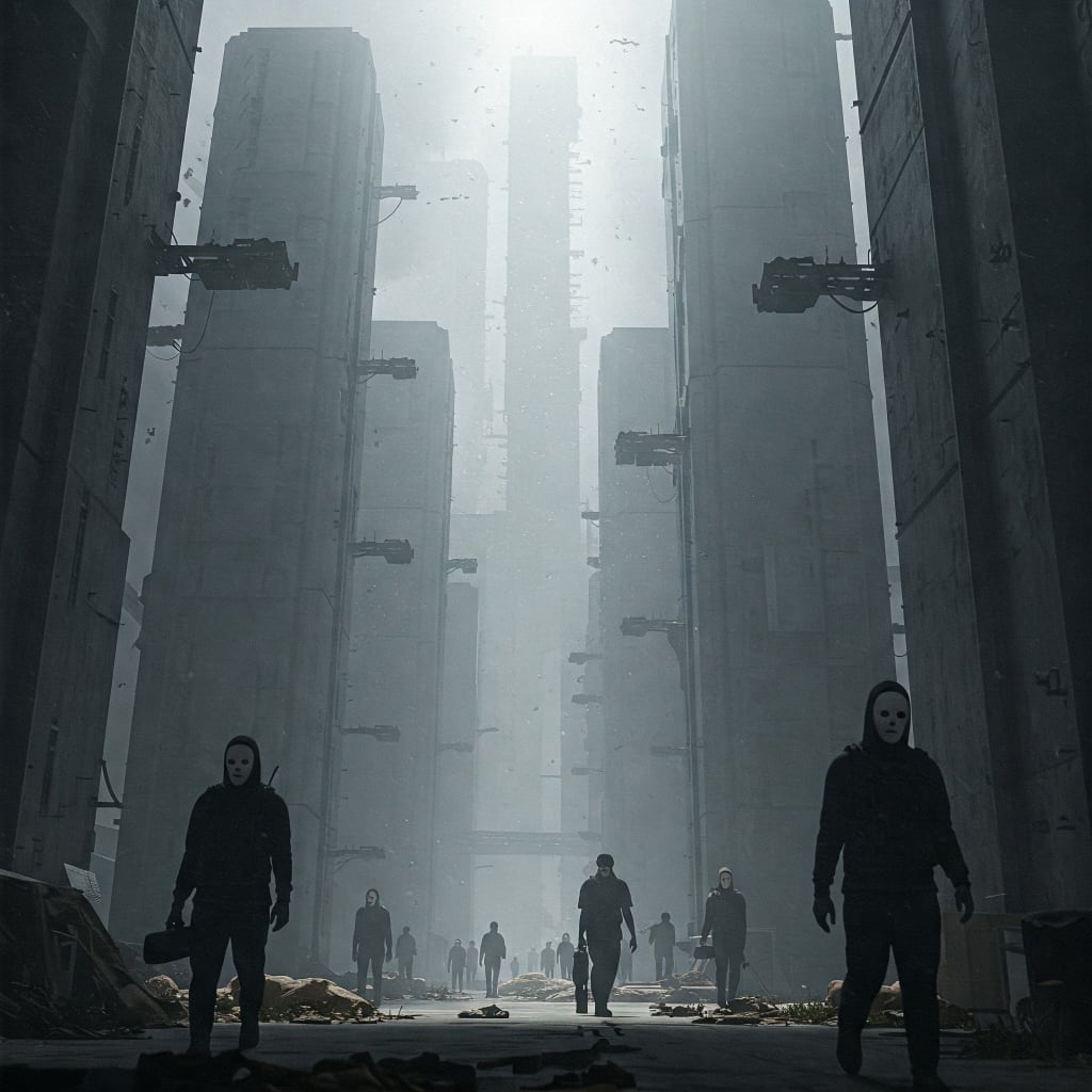 Elara lives in a small, gray apartment in a city that stretches as far as the eye can see. The buildings are tall and block out most of the sun. The air is thick with a strange smell, a mix of dust and something chemical. Everything is made of metal and concrete, cold and hard.