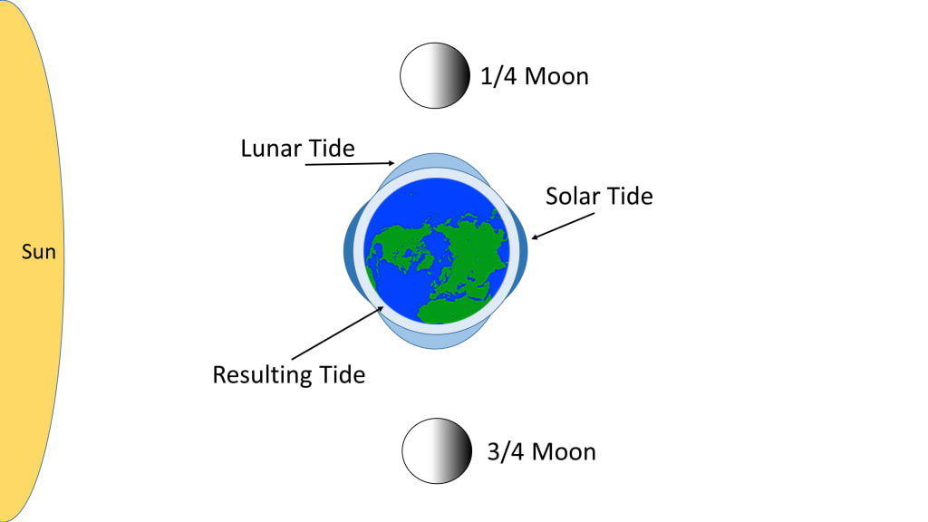 The Moon's gravitational pull causes water on the side of Earth facing the Moon to be drawn towards it, creating a bulge known as the tidal bulge. On the opposite side of the Earth, another bulge forms due to the centrifugal force generated by the Earth-Moon system’s rotation. These two bulges result in high tides in the affected regions. In contrast, areas between these bulges experience low tides.