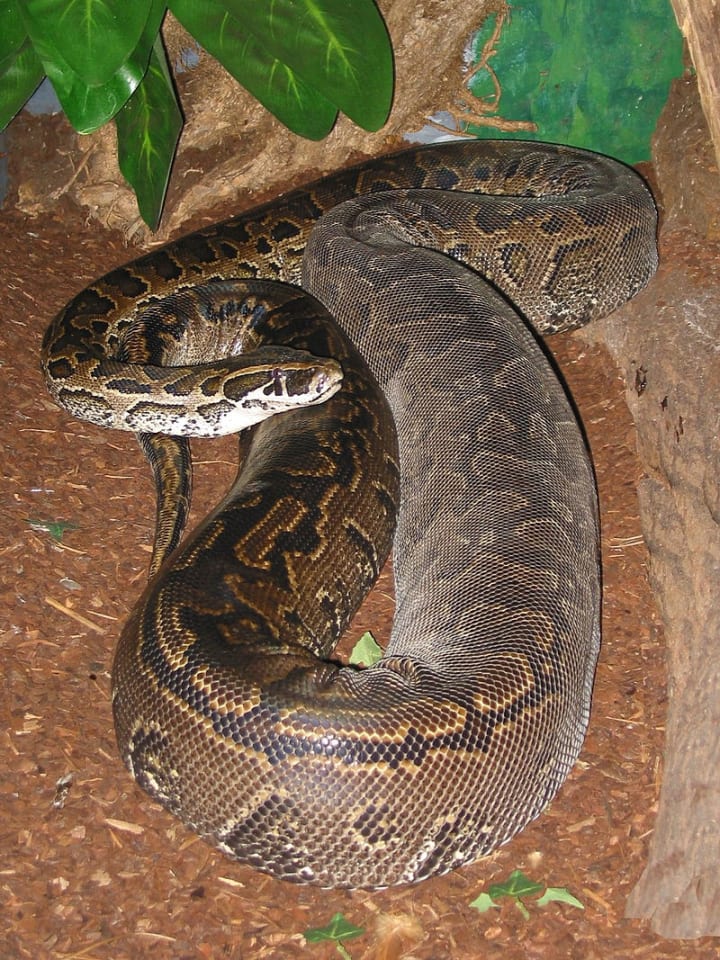 9. Indian Rock Python (Python molurus): Similar in appearance to the African rock python, the Indian rock python inhabits a wide range of habitats in the Indian subcontinent, including forests, grasslands, and agricultural areas. It can grow up to 13 feet (4 meters) in length. The Indian Rock Python typically weighs between 20 to 40 kilograms (44 to 88 pounds), with some individuals reaching up to 90 kilograms (200 pounds).