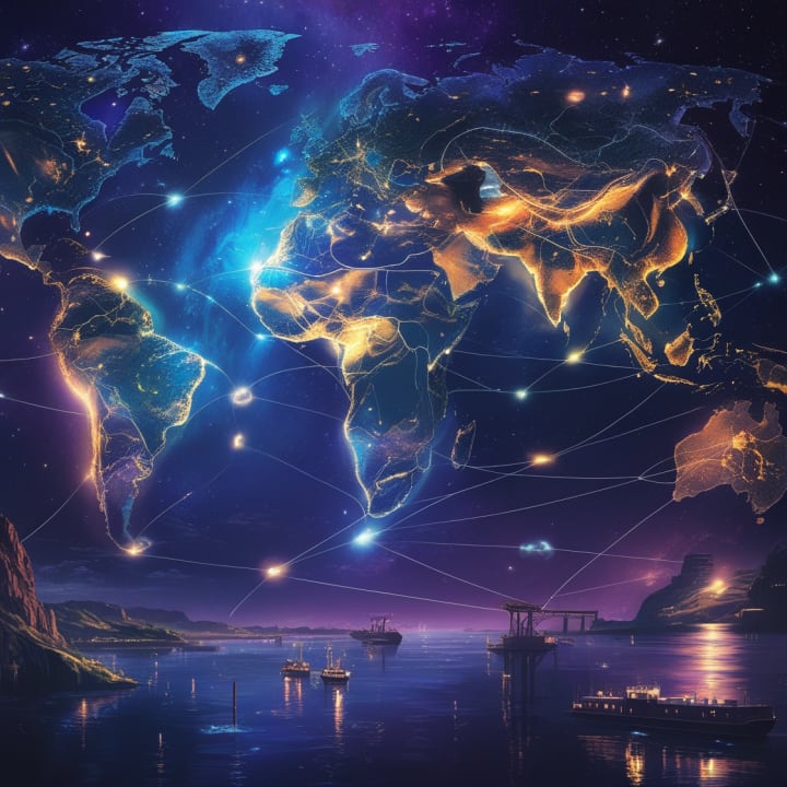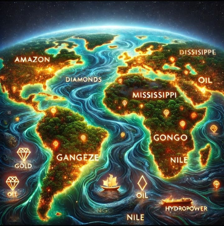 This stunning illustration showcases the world's richest rivers and their vast natural resources. Featuring glowing depictions of the Amazon, Mississippi, Yangtze, Ganges, Congo, and Nile, each river is marked with icons representing gold, diamonds, oil, fertile land, and hydropower. The artwork highlights the economic significance of these waterways, illustrating how they have shaped civilizations and continue to be invaluable sources of wealth.