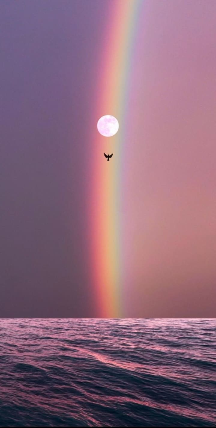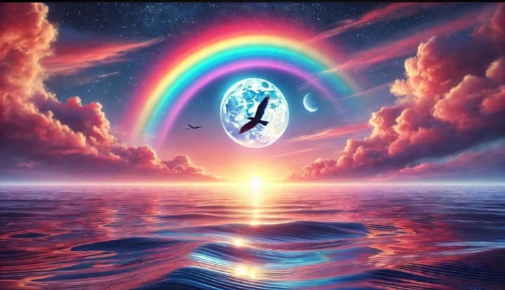 This image resonates beyond the literal; it speaks to the human longing for peace and connection. The reflective ocean, the harmonious rainbow, and the glowing moon create an almost otherworldly scene, inviting introspection. In many cultures, rainbows are seen as bridges between realms, while birds are messengers of hope, guiding lost souls to light.