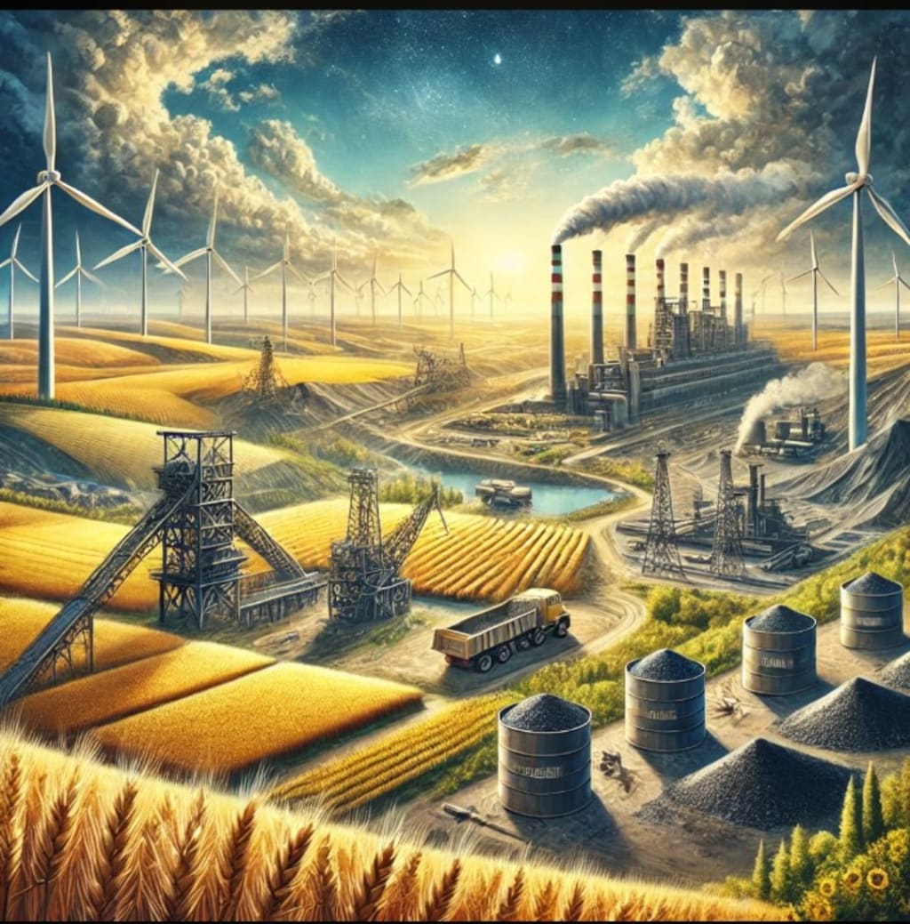 A highly detailed illustration showcasing Ukraine's vast natural resources. The image depicts golden wheat fields symbolising its agricultural richness, coal mines and iron ore deposits representing its industrial backbone, and modern wind turbines highlighting its commitment to renewable energy. A harmonious blend of tradition and progress under a vibrant sky captures the essence of Ukraine's diverse resource wealth.