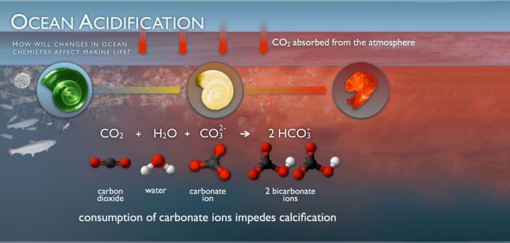 Surprise, surprise: what we do on land affects the sea. Our oceans absorb 30% of carbon dioxide in the atmosphere. One result of this is that pH levels of surface waters have decreased by 0.1, which may not sound like a lot but is really a lot. The reason for this is that when carbon enters the water, it doesn’t just sit in there like an emulsion. It chemically interacts with the seawater. The CO2 combines with the H20 to create a weak acid. So “acidification” of the ocean is actually what’s happening.