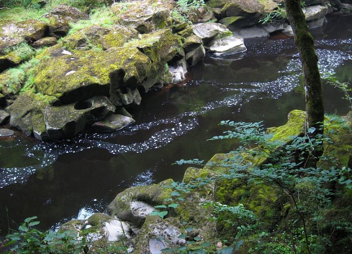 The Strid is a series of waterfalls and rapids where water from the river is forced, under great pressure, through a natural channel carved into the local sandstone.
