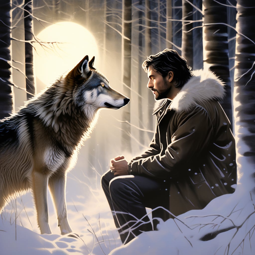 One day, as Sam ventured deeper into the woods, a pair of golden eyes observed him from the shadows. Luna, a magnificent white wolf with fur as pure as the moonlight, approached with a graceful stride. Sam, initially cautious, felt an inexplicable connection with this wild creature. It was as if the forest itself had chosen to reveal a secret companion.