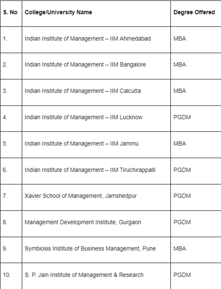 The best popular colleges for MBA/PGDM in India table above shows that IIMs continue to be India's top business schools. However, colleges like SPJIMR, XLRI and MDI are also giving them tough competition regarding quality education and placements.