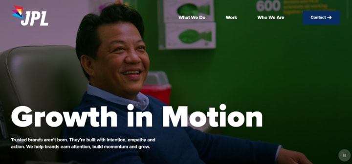 JPL positions itself as an agency focused on "Growth in Motion," helping brands earn attention, build momentum, and grow through integrated strategies across multiple sectors.
