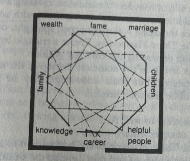 In this chart, four mystical triangles are formed. At first glance, each triangle appears to connect three of the eight life situations at its angles. However, these formations are not based on the life situations themselves. Instead, they are determined by the positions of the Twelve Chinese Zodiac Signs, which do not explicitly appear on the Three Harmonies chart.