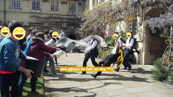 At my college, you’d sit your exams, then walk back with your college coursemates to get trashed in 2nd Quad. We ran through the arch and all our friends gathered on the grass to douse us in water with buckets.