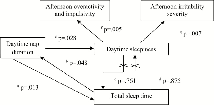 This model demonstrates the interpersonal relationships between the findings from this study and their significance. This model shows how longer nap time duration caused a shorter duration of sleeping from the start of bedtime and shorter sleep during the night added to the duration of nap time the next day. Some relationships were found to be irreversible and only worked forwards. With this, daytime sleepiness did not predict the total sleep time of the children that night and total sleep time did not work in predicting daytime sleepiness in the individuals as well. The duration of daily naps was found to have an impact on the sleepiness of the children and played into behavioral problems. Higher levels of sleepiness were found to be directly correlated to the irritability and impulsivity of the children.