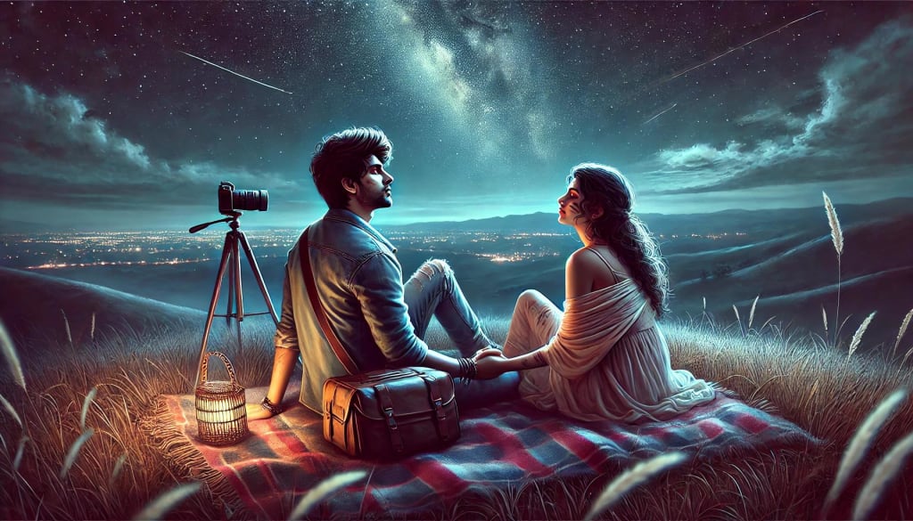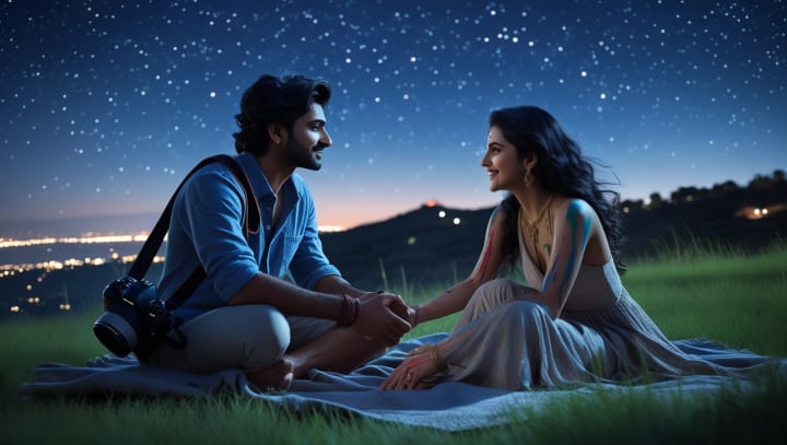When Aryan finally returned, it was on the night of Meera’s big exhibition. He walked into the gallery, his heart pounding. And there she was, standing by her painting—a masterpiece of colors and emotions. It depicted a hilltop under a starry sky, with two figures sitting side by side.