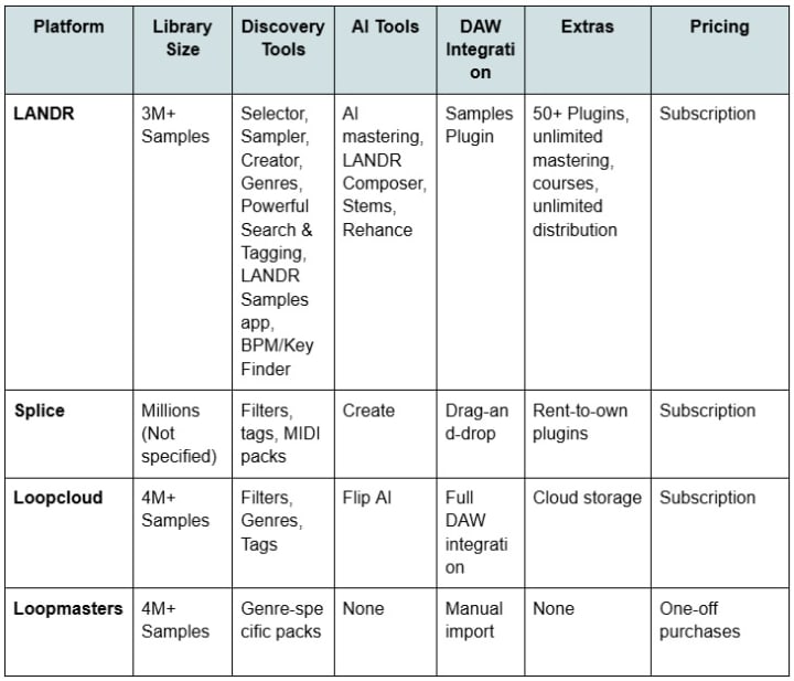 Splice, Loopcloud, Loopmasters, and LANDR Samples, and explain why LANDR has quietly pulled ahead in 2025.